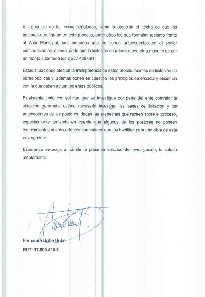 Para la colectividad existen vicios y situaciones que deben ser esclarecidas, por este motivo consideran una irresponsabilidad que existan postores que no tienen mayores datos de construcción en la zona, ni antecedentes en esa materia. “Ciertamente que existan postores que no tengan antecedentes en construcción, afectan la transparencia de la licitación y dañan los principios de eficacia y eficiencia que deben tener los entes públicos”, puntualizaron.