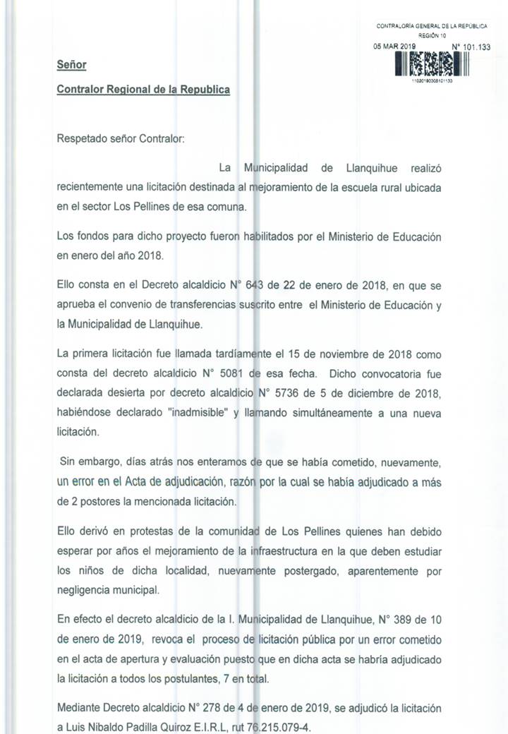 Por eso, dirigentes regionales Progresistas presentaron un documento que solicita al contralor regional que inicie una investigación en la fallida licitación pública “Proyecto Mejoramiento Escuela Rural Los Pellines” de Llanquihue. “Hoy le pedimos al contralor que se pronuncie en esta licitación, pues ha quedado en evidencia la negligencia municipal en el proceso. Asimismo le solicitamos realice una investigación de las bases de licitación y oferentes”, señaló la dirigencia regional del Partido Progresista.